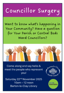 Councillors Surgery, Saturday 22nd November 2025 10am – 12 noon @ Barton-le-Clay Library 13th November 2025