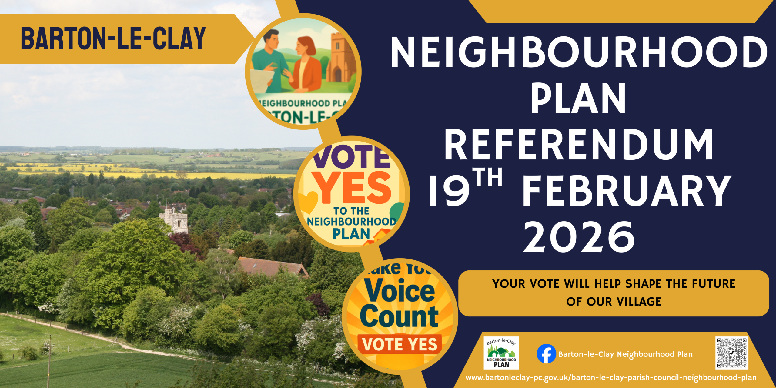Neighbourhood Plan – Briefing Event Calendar Add to Calendar Add to Timely Calendar Add to Google Add to Outlook Add to Apple Calendar Add to other calendar Export to XML When: 11th February 2026 @ 2:00 pm – 4:00 pm 2026-02-11T14:00:00+00:00 2026-02-11T16:00:00+00:00 Where: Barton Library Bedford Road Barton-le-Clay Cost: Free Contact: Carolyn Callen 01582 883990 Email Events